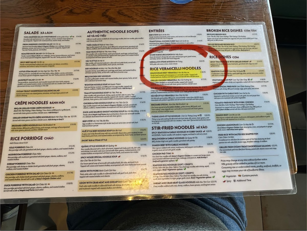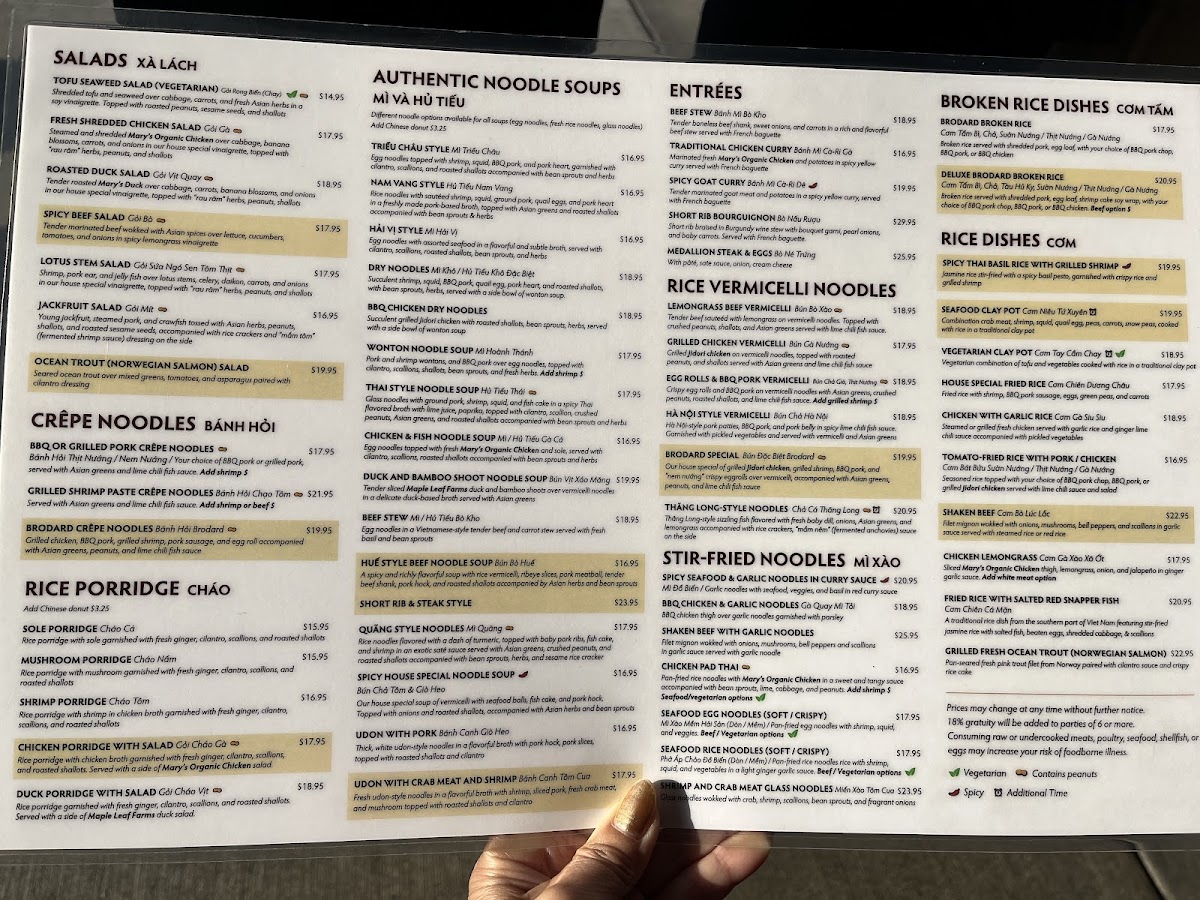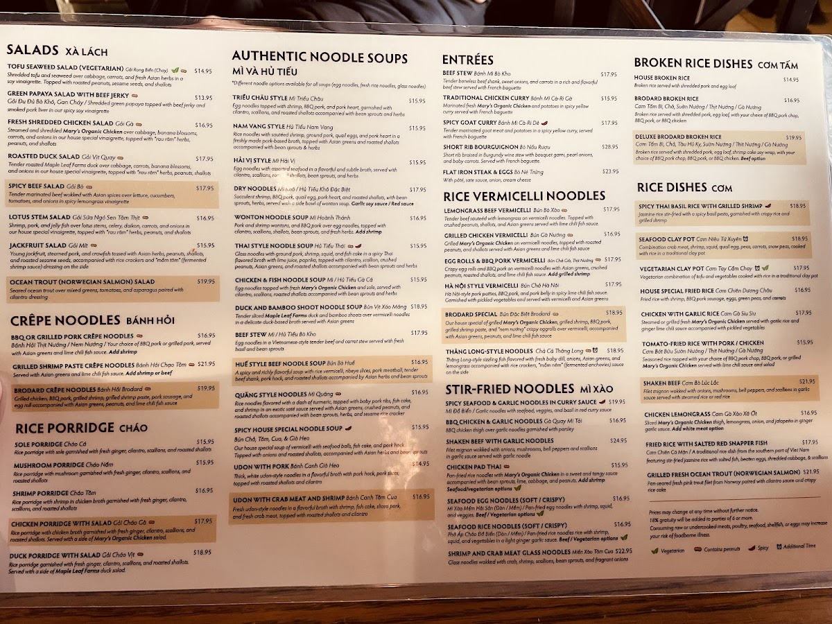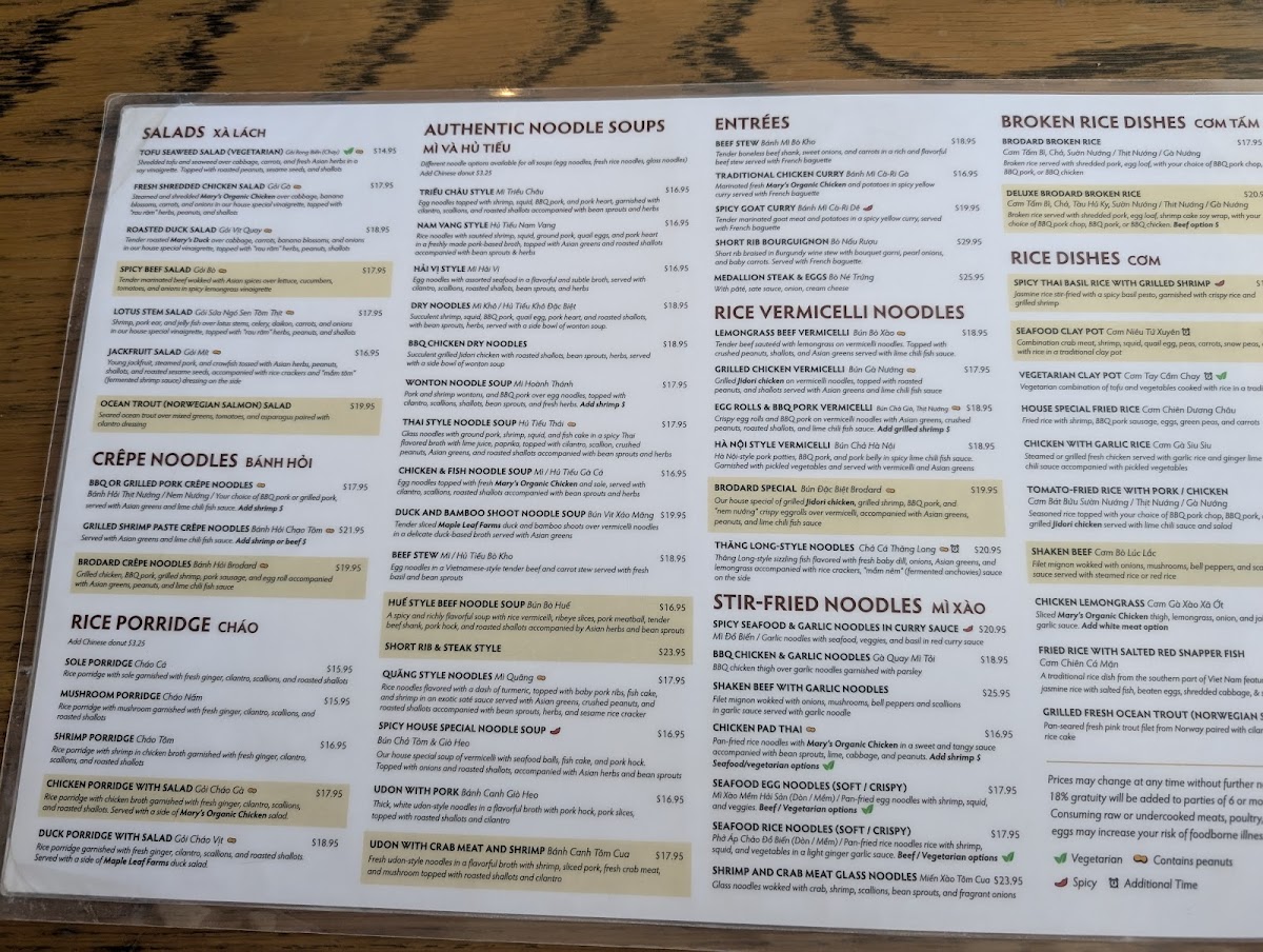 On the savory side, the menu features casual bites such as grilled pork spring rolls and fresh noodle soups that provide satisfying warmth and depth. These dishes are complemented by vibrant salads and hearty noodle plates like the shaken beef with garlic noodles, creating a balanced experience that reflects both comfort and freshness. At the same time, bakery specialties like French macarons and Vietnamese coffee offer a sweet and soothing finish or a welcoming pick-me-up during any time of day.